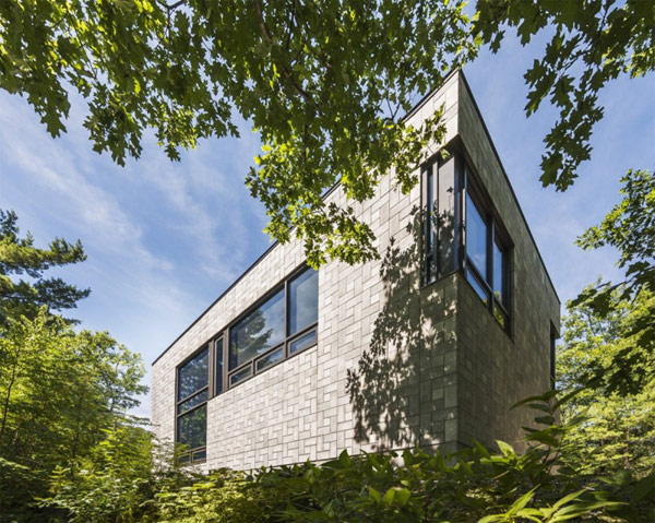 Cuando se trata de un presupuesto restringido, los desafíos pueden resultar ser intimidantes. No para Kariouk Asociados, que logró diseñar un hogar contemporáneo funcional y atractivo para sus habitantes, una pareja de adultos y sus hijos adolescentes. Situado en Gatineau, Quebec, Canadá, la residencia muestra una forma compacta, caracterizando su volumen de mampostería simple. Aquí hay más información proporcionada por los arquitectos: " En respuesta a un presupuesto muy modesto del proyecto, industriales bloques de hormigón se utilizaron como la chapa exterior, pero de una manera poco convencional: el material bruto está dispuesto en un patrón en molinete produciendo una fachada alegre lanzando profunda sombras. Debido a que la casa es bastante pequeña para una familia grande y un exterior, proyectado en sala de estar, el comedor fue diseñado para el techo plano. Una vez completado, este espacio se accede por una escalera exterior de acero, que une a la zona de vida interior y sala de estar exterior. "En cuanto a la estructura interior se refiere, los espacios más utilizados por los adolescentes, sus dormitorios, una sala de televisión, y equipos deportivos de almacenamiento están situados en la planta baja. mientras que las áreas formales de la casa se dan las vistas más privilegiadas en el segundo nivel.